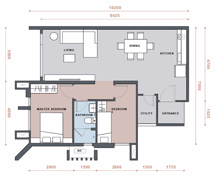 | ROOM TYPE | 2 bedrooms + 1 bathroom |