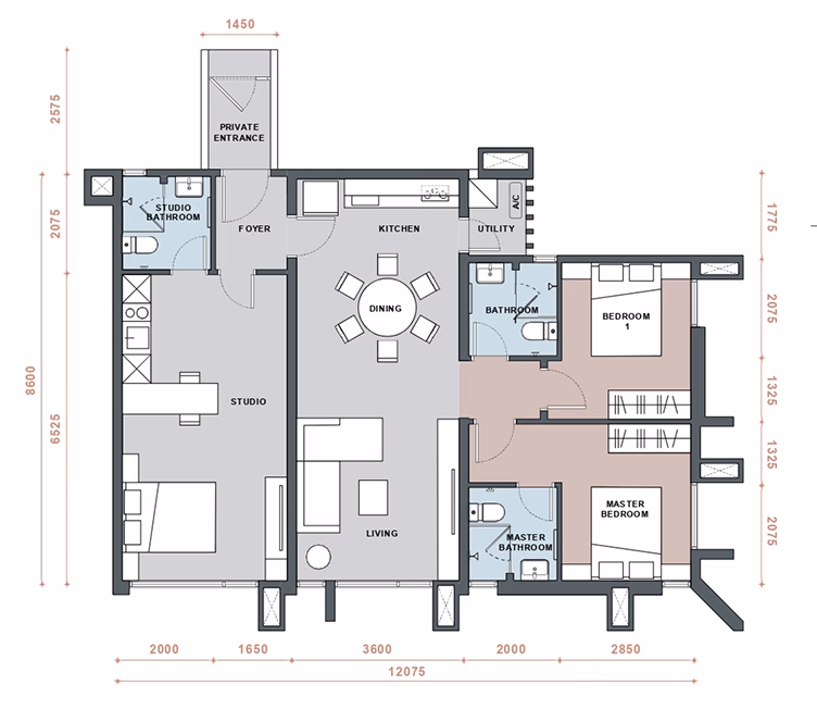 | ROOM TYPE | 1 studio + 2 bedrooms + 2 bathrooms |
